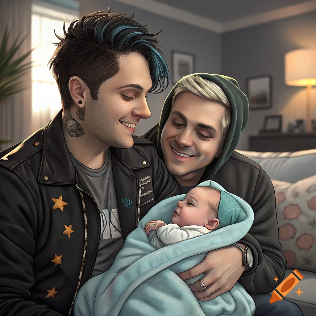 Two men smile lovingly at a baby they hold wrapped in a blanket in a