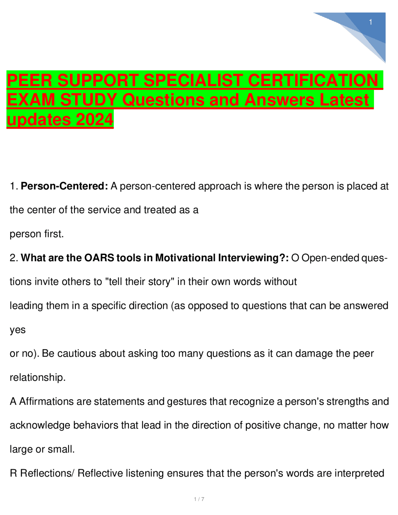 PEER SUPPORT SPECIALIST CERTIFICATION EXAM STUDY Questions and Answers