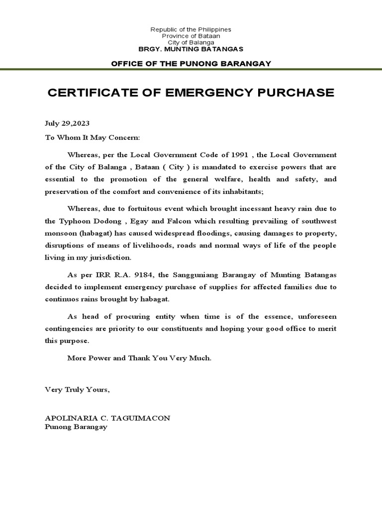 CERTIFICATE OF EMERGENCY PURChase Egay Habagat PDF