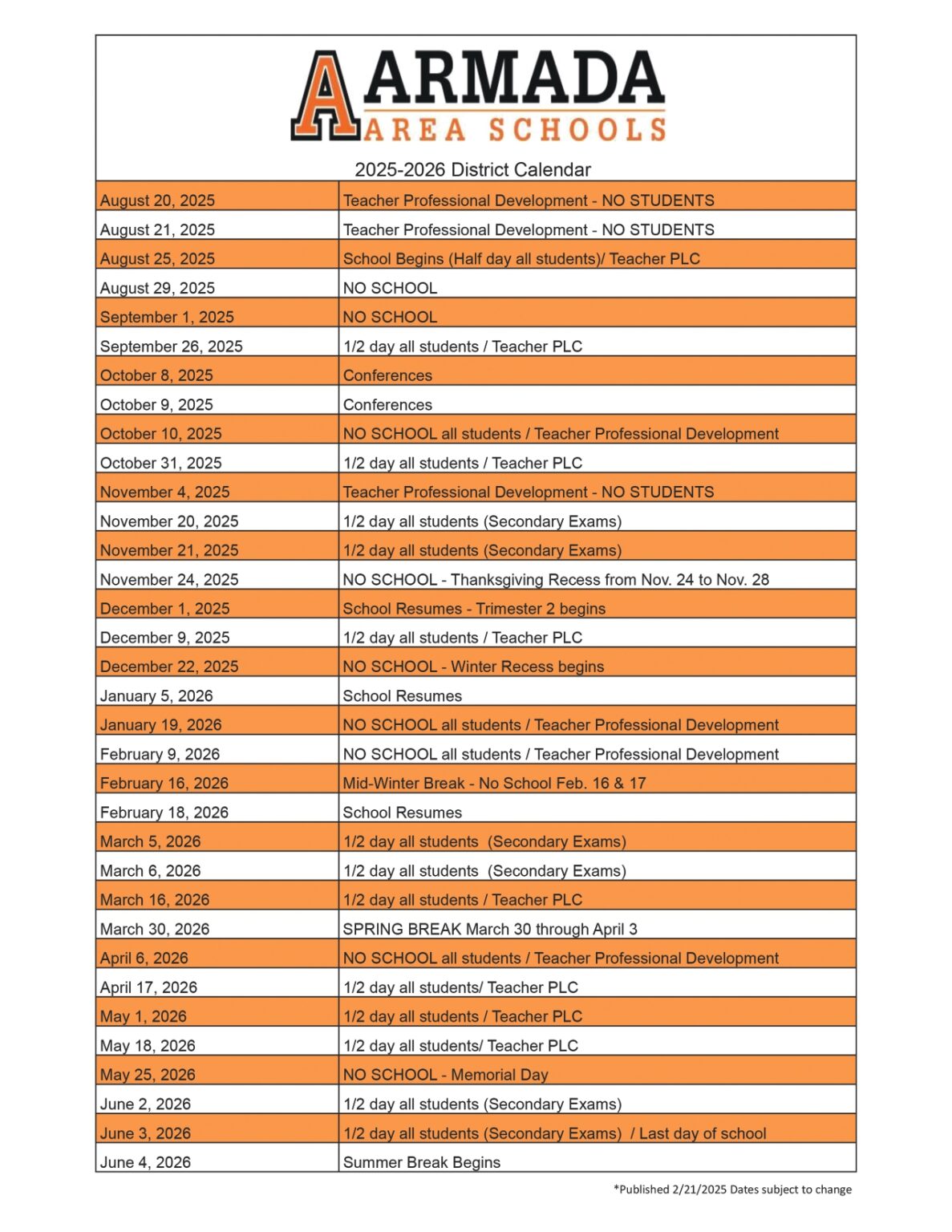 Armada Area Schools MI Calendar 25 26 Revised pdf EduCounty
