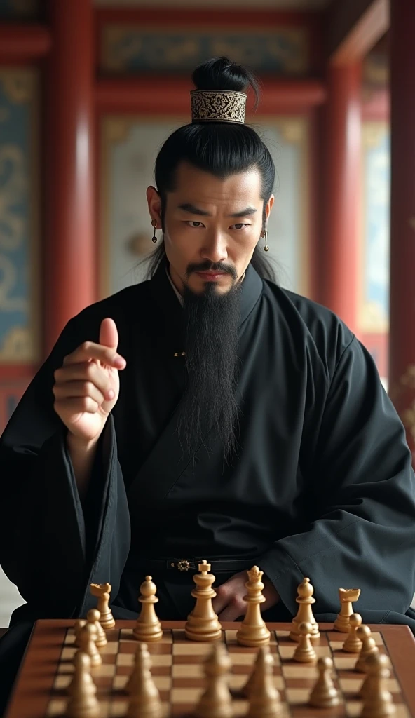 Image: Cao Cao sitting in an ancient study room a Chinese chessboard