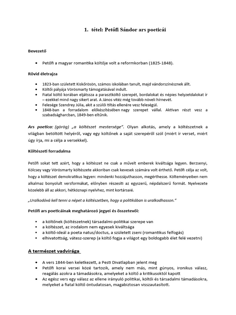 1 Tétel Petőfi Ars Poeticái PDF