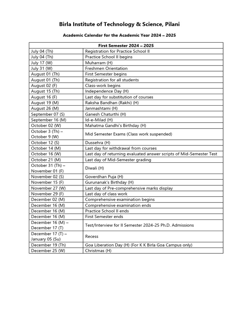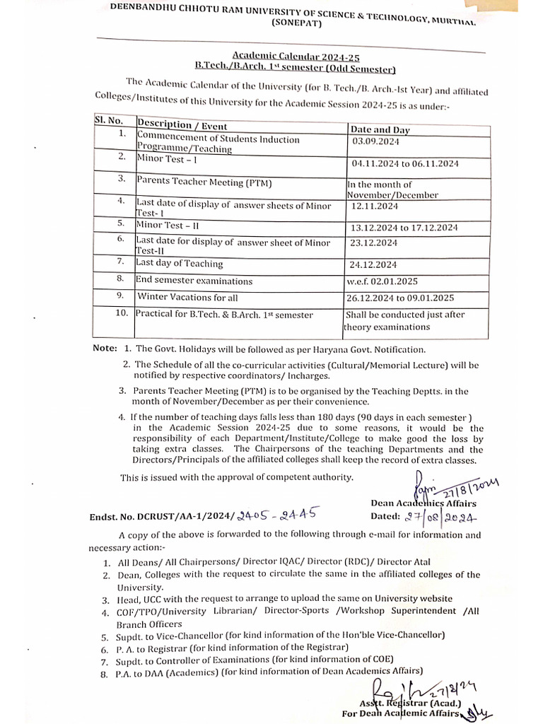Academic Calendar 2024 25 B Tech B Arch 1st semester PDF
