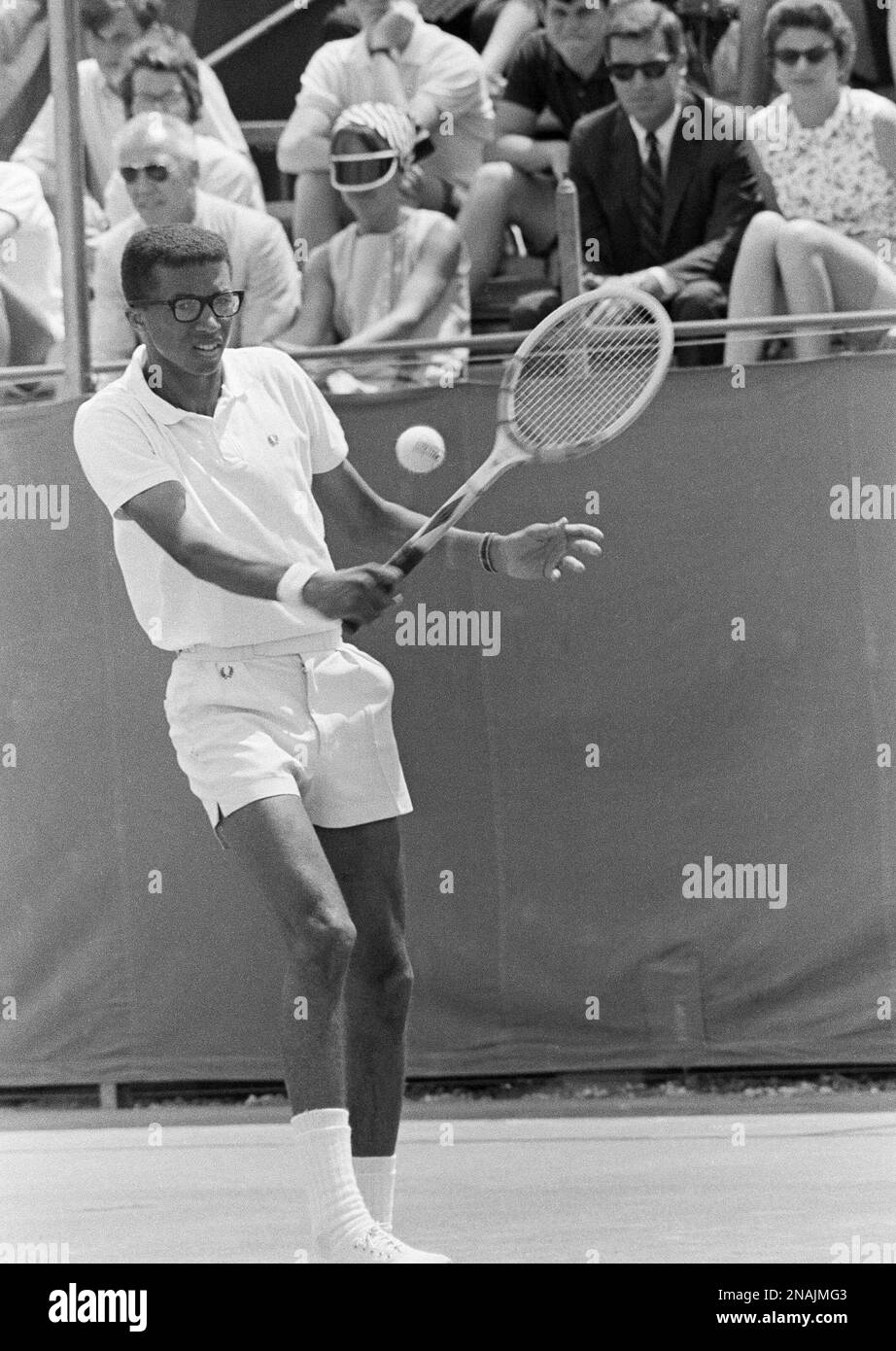 Lt Arthur Ashe smashes a return to Tom Okker of the Netherlands