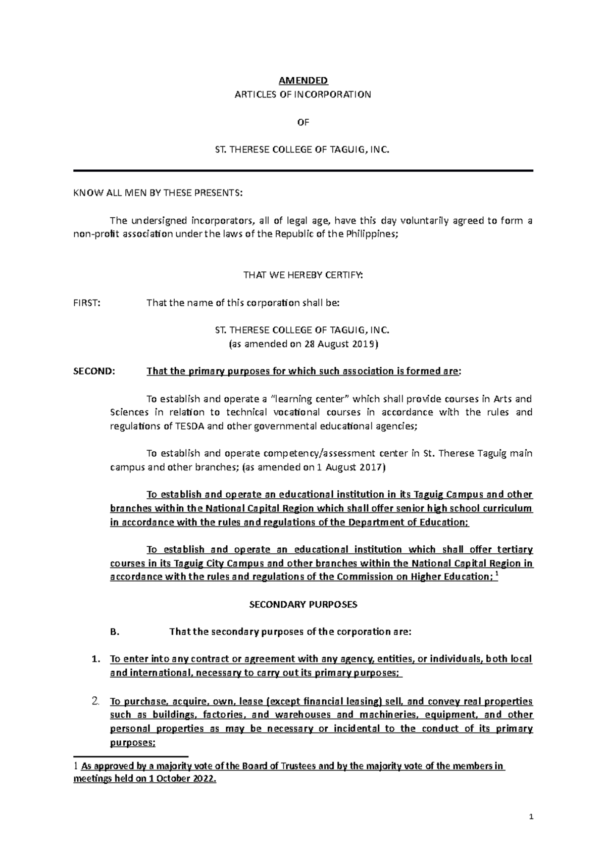Articles Of Incorporation Amendment Template