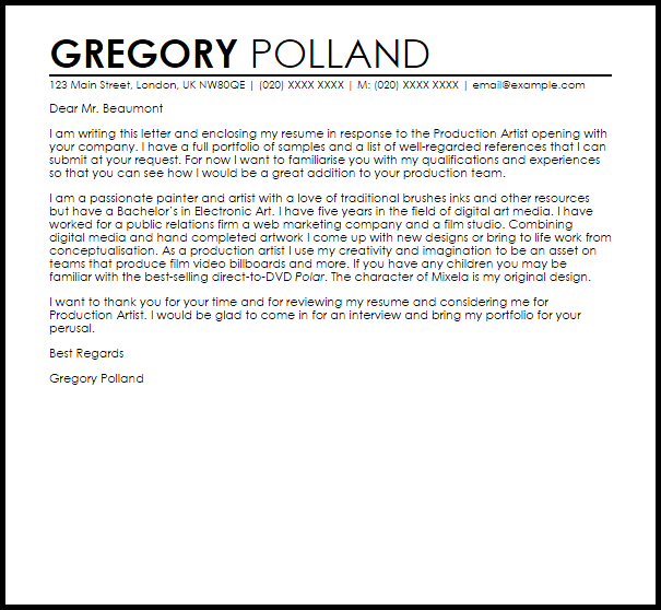Production Artist Cover Letter in Word Google Docs Download
