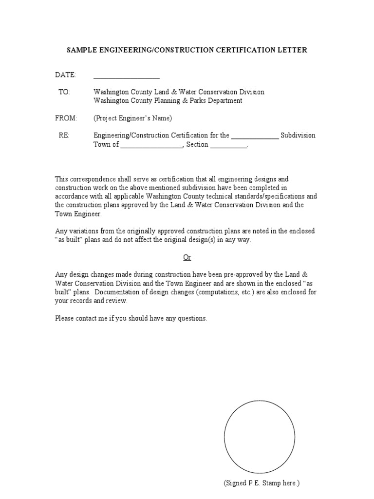 Sample Engineering/Construction Certification Letter PDF