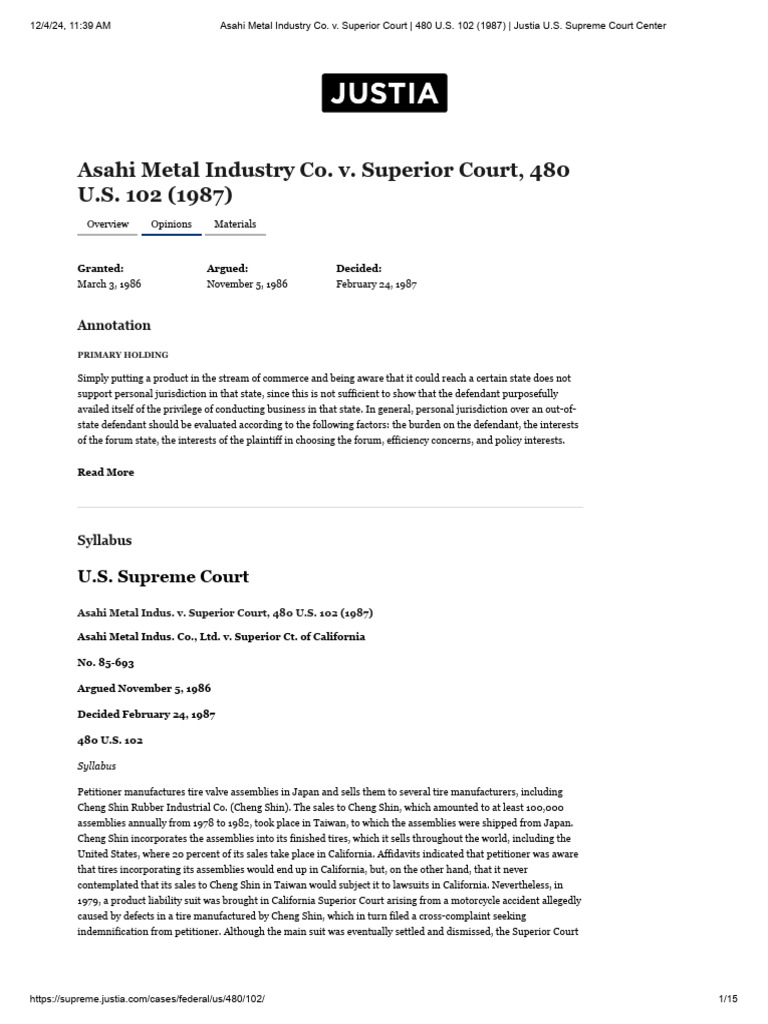 Asahi Metal Industry Co vs Superior Court Printable Case Brief from