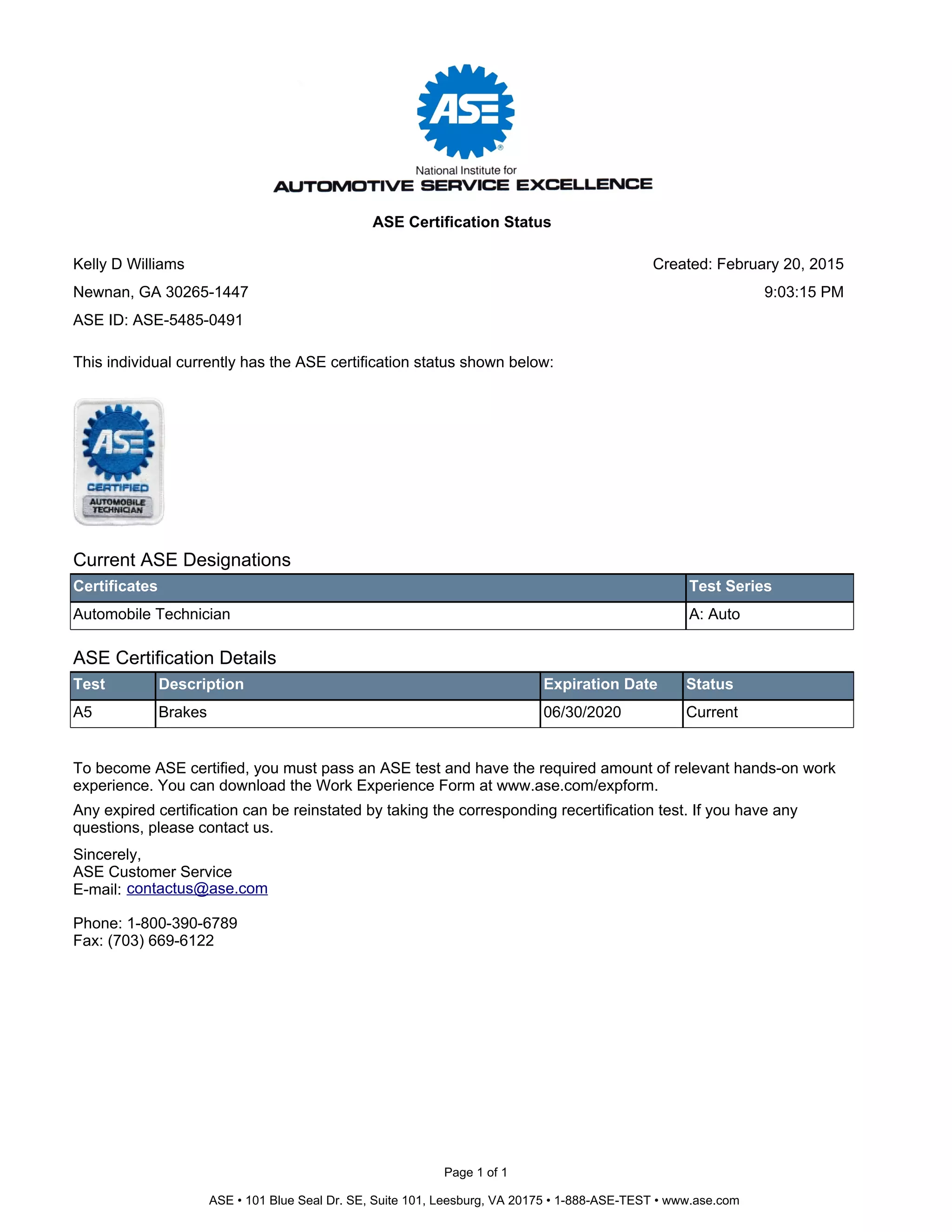ASE certification/ASE MLR Certification/ASE Brake Certification/ASE A4