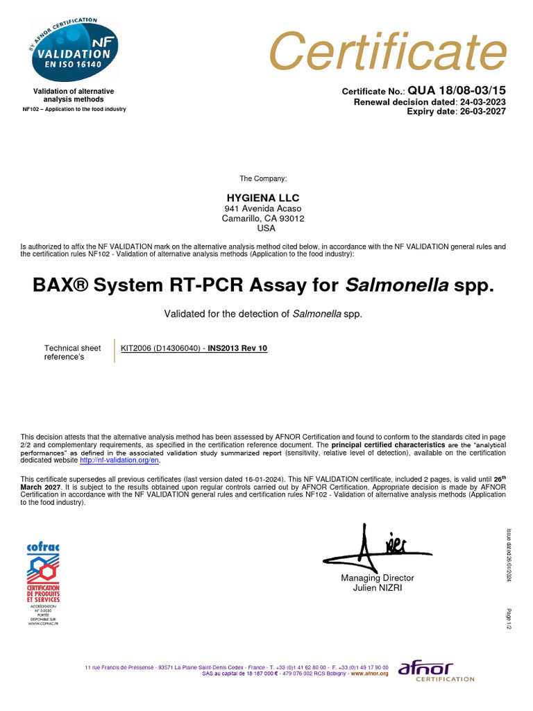 Bax System Real Time Salmonella Assay Afnor Certificate en PDF