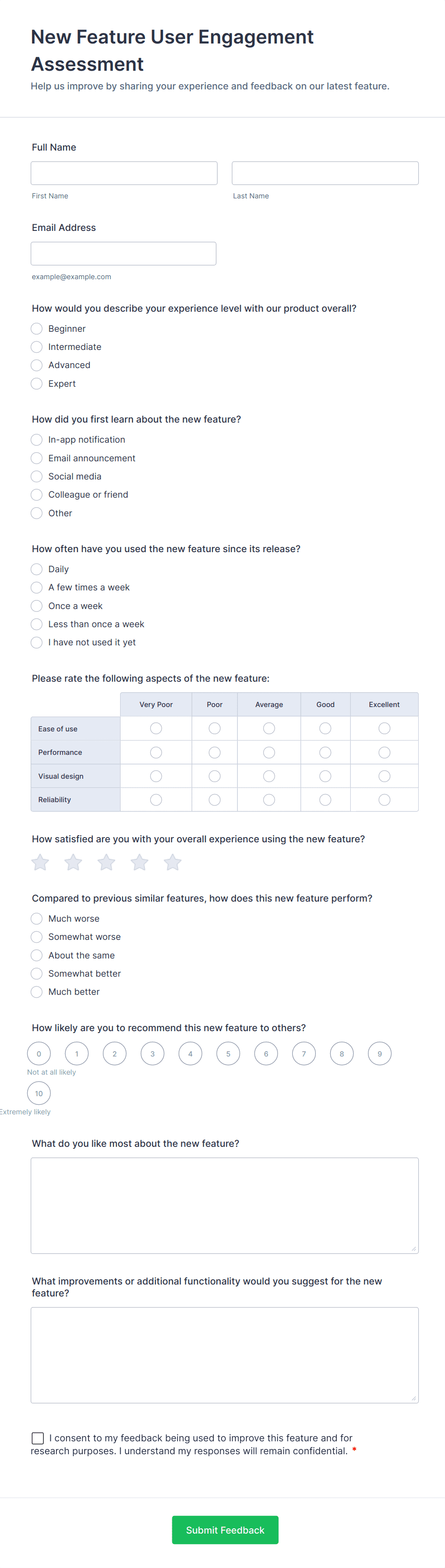 New Feature User Engagement Assessment Form Template Jotform