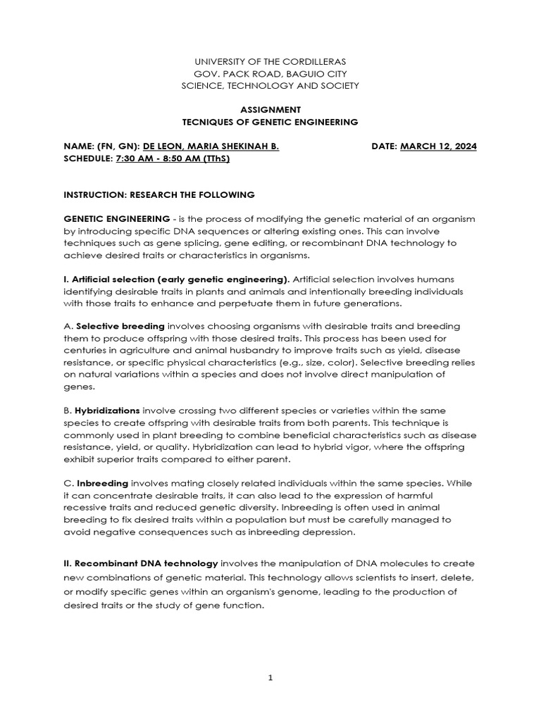 Assignment Techniques of Genetic Engineering PDF Genetically