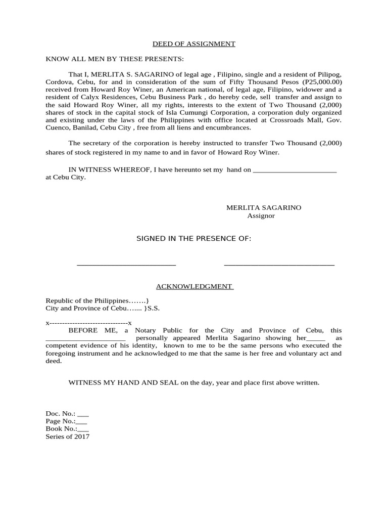 DEED OF ASSIGNMENT Shares Sagarino PDF
