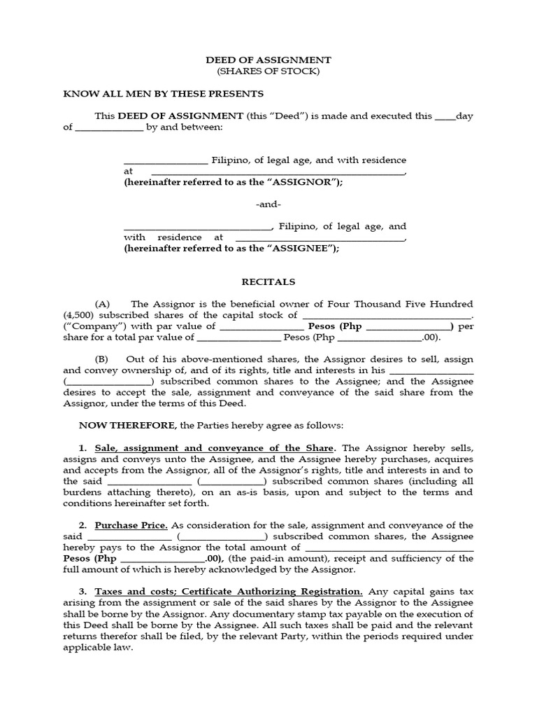 Deed of Assignment of Shares of Stock PDF Assignment (Law