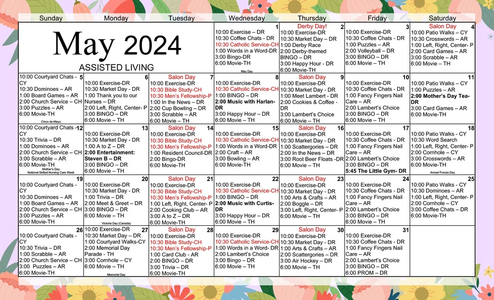 April 2022 Calendar Activities: Assisted Living Traditions at North