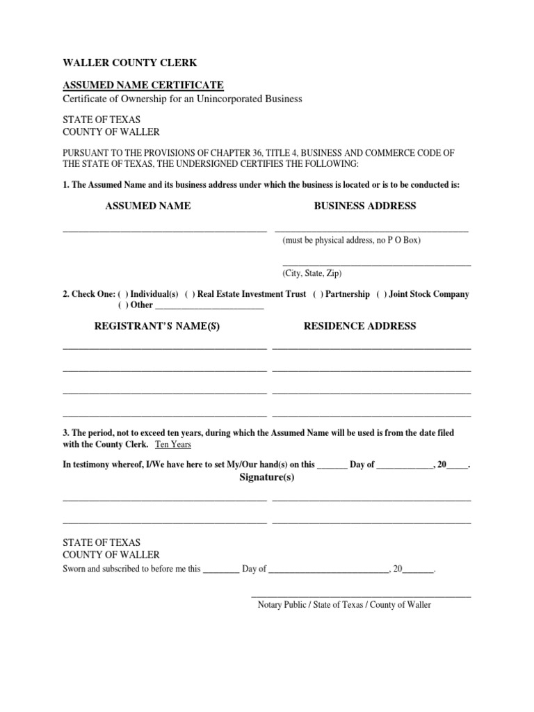 Texas Waller County Clerk Assumed Name Certificate PDF
