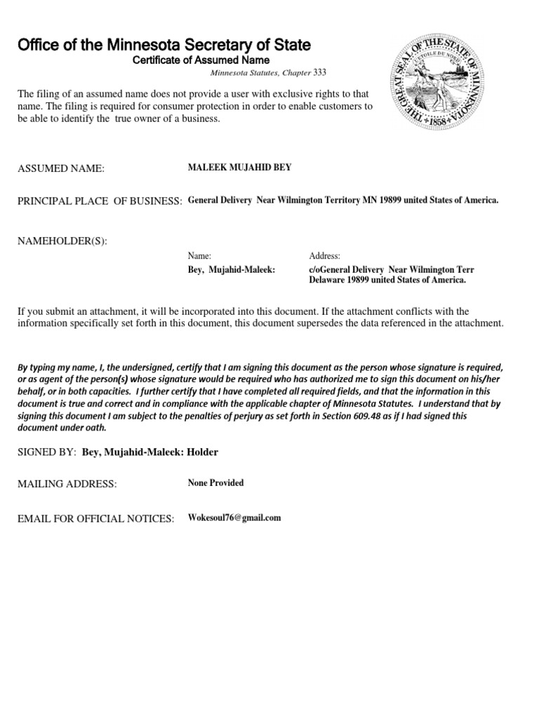 Public Notice Office of the Minnesota Secretary of State Assumed Name