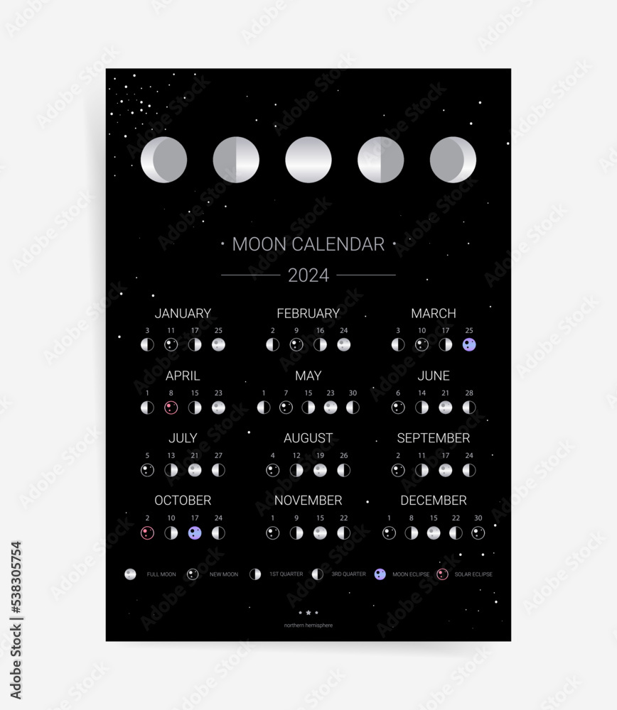 One page black moon calendar 2024 year card Modern celestial lunar