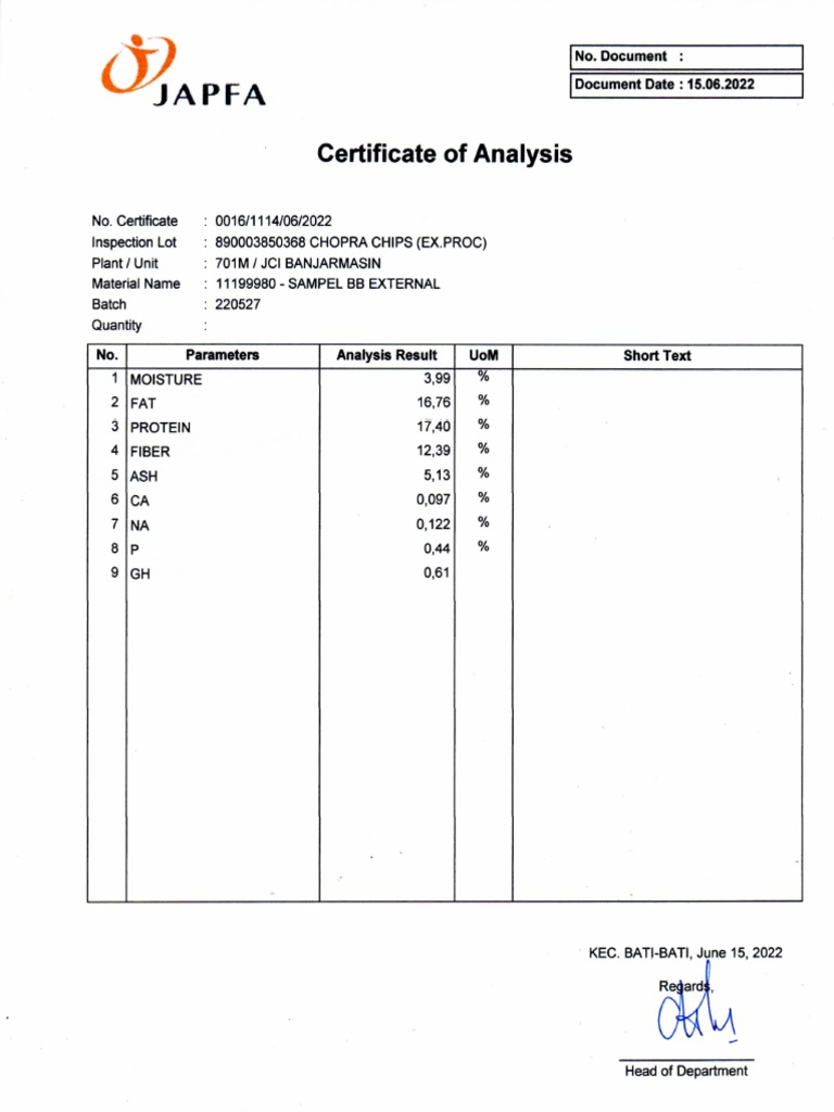 Japfa Certificate Analysis of Copra Cake Chips PDF
