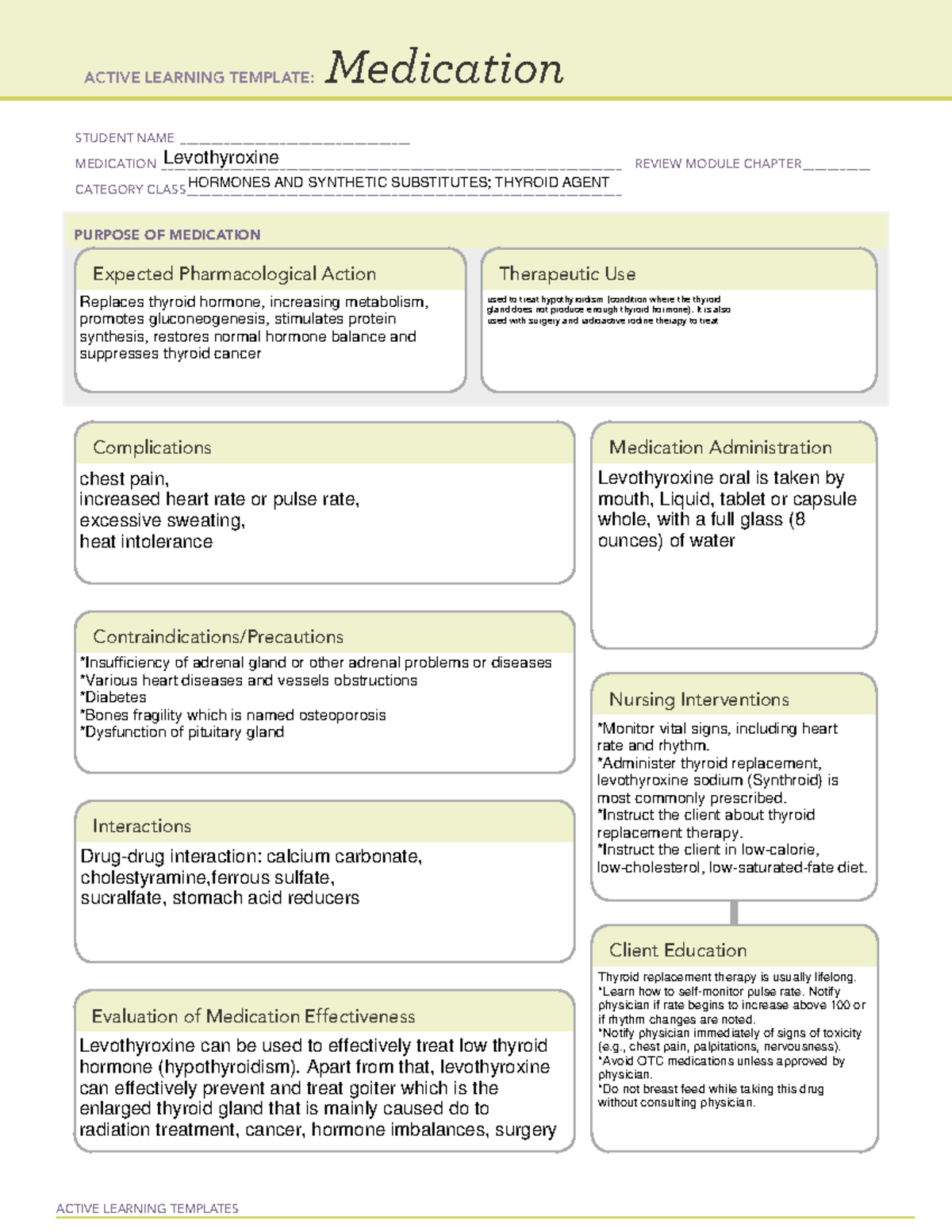 Levothyroxine medication template for ATI ####### ACTIVE LEARNING