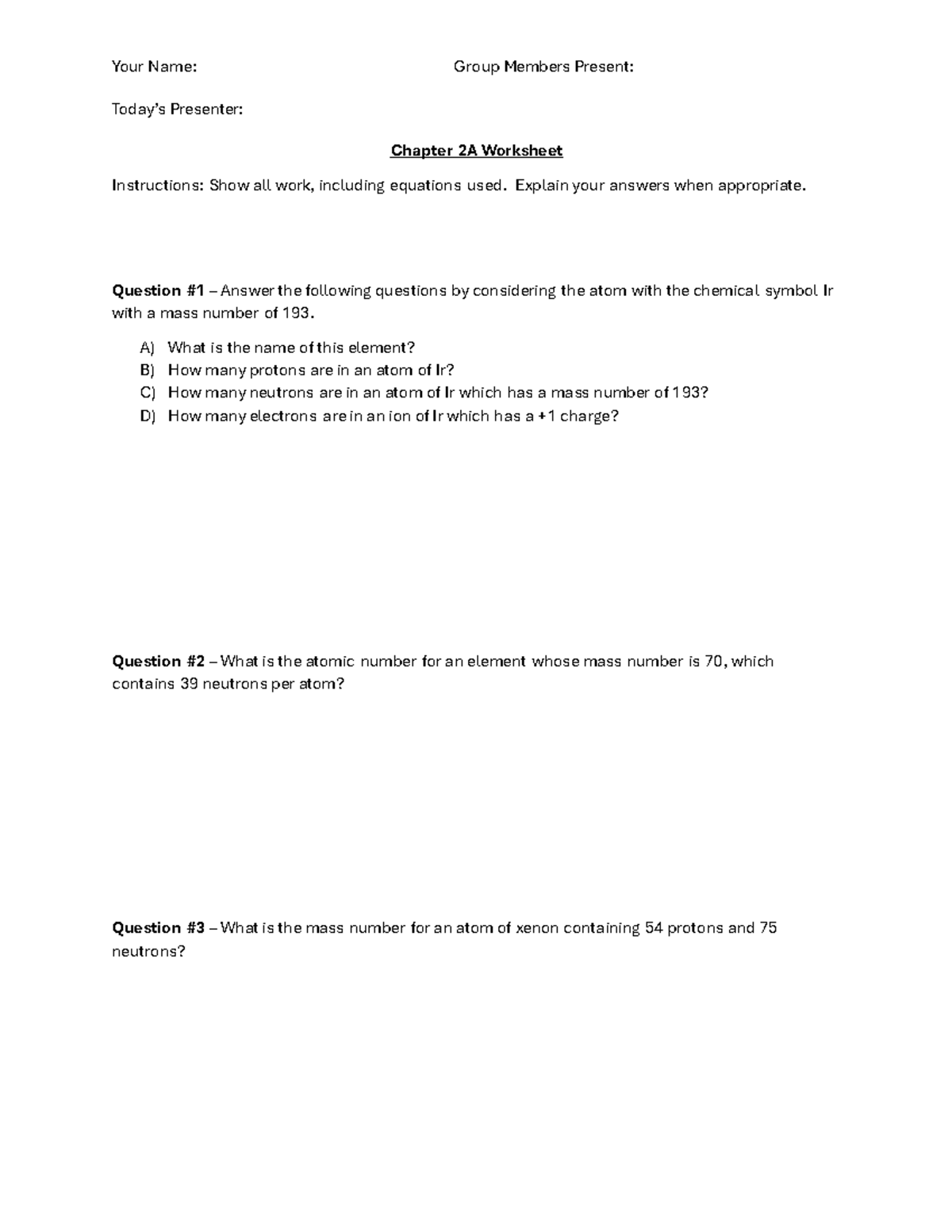 Chapter 2A Worksheet: Element Properties Isotope Calculations Studocu