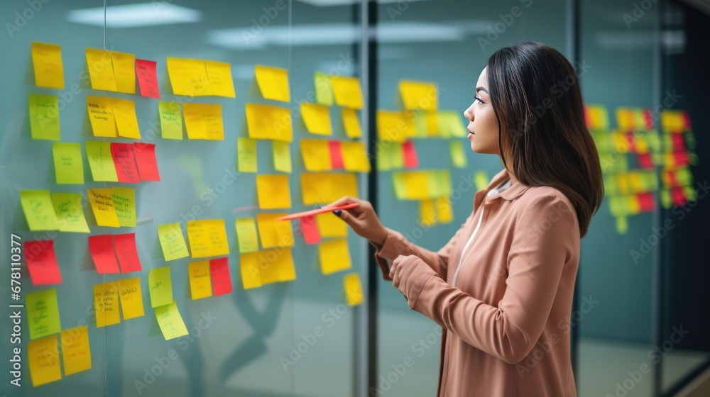 Premium AI Image Woman organizer attaches colorful sticky notes with