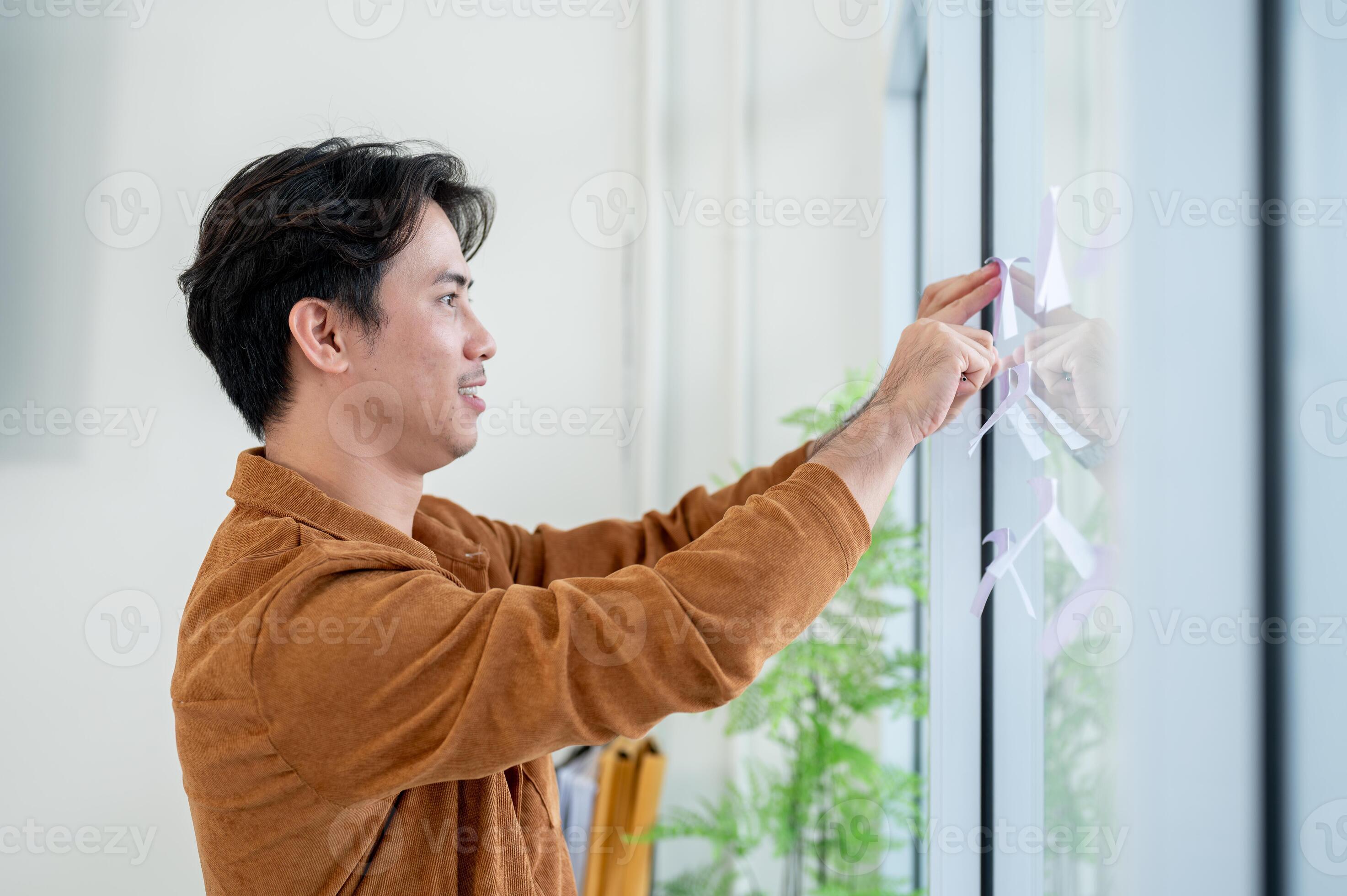 A positive handsome Asian businessman attaches sticky notes on a glass