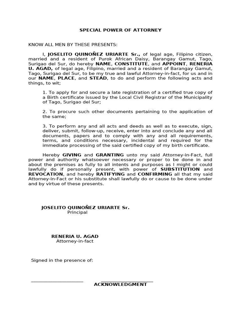 SPECIAL POWER OF ATTORNEY (URIARTE) PDF Power Of Attorney Birth