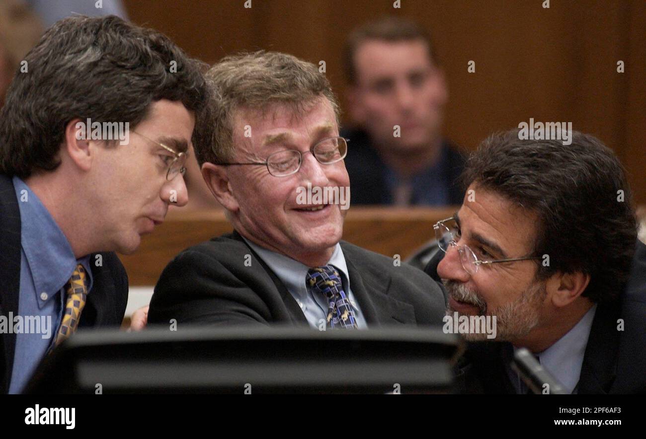 Michael Peterson center talks with his attorneys Thomas Maher left
