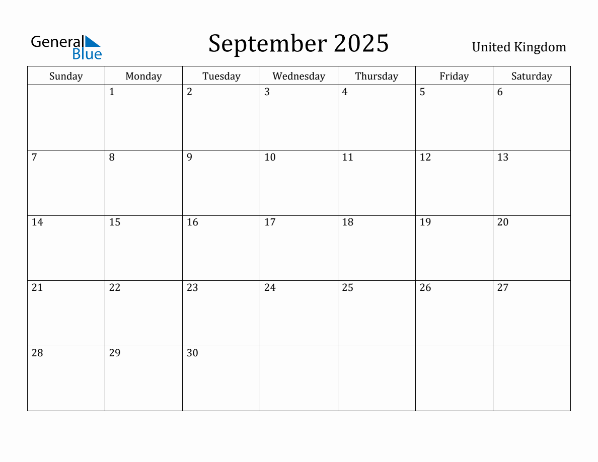 September 2025 Monthly Calendar with United Kingdom Holidays