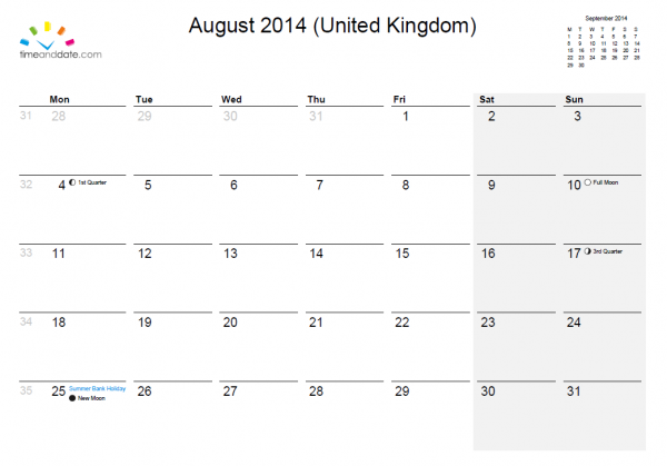 Calendar August 2014 UK with PDF Excel and Word templates
