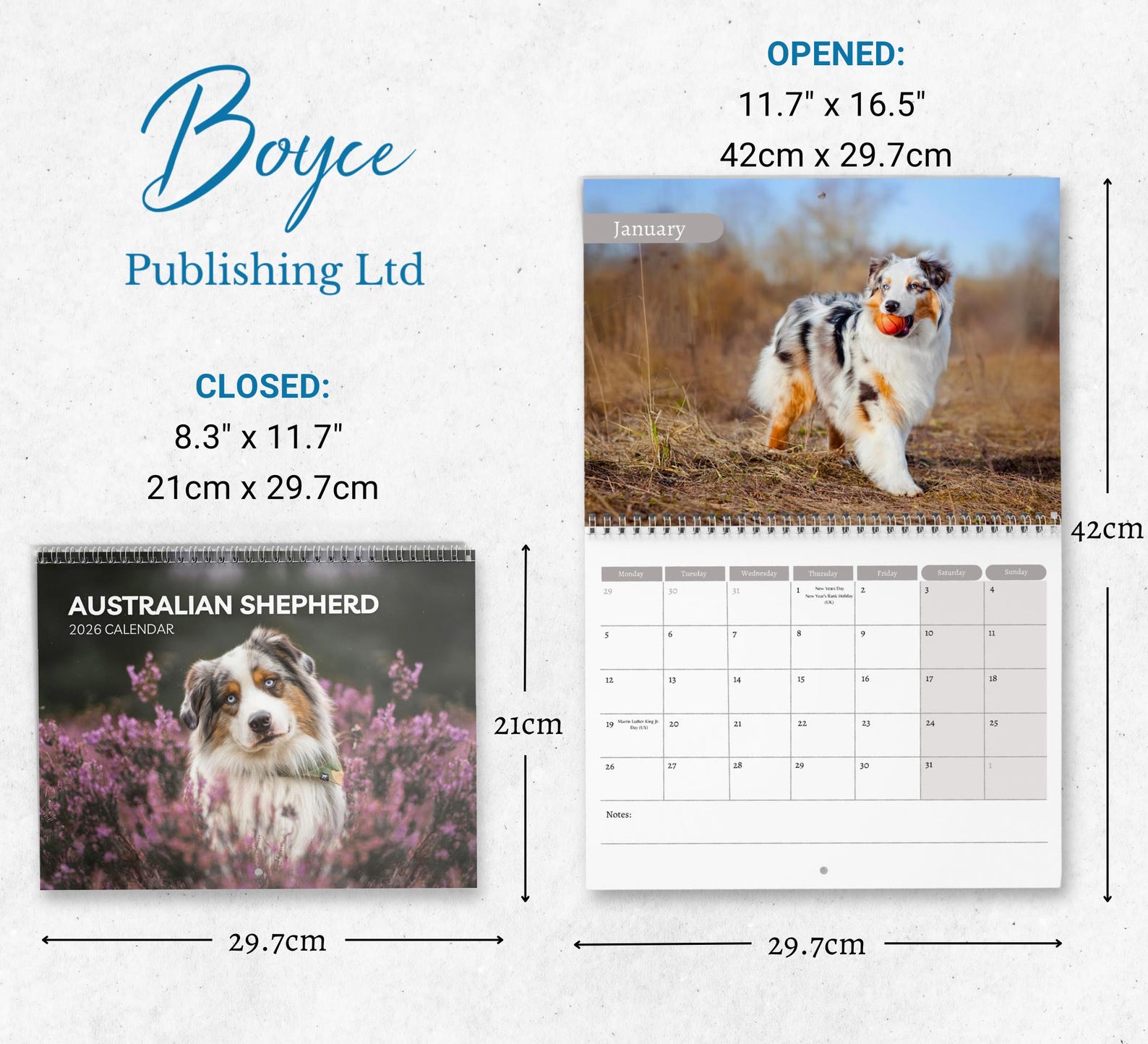 Australian Shepherd Calendar 2026: Monthly Wall Calendar With Notes