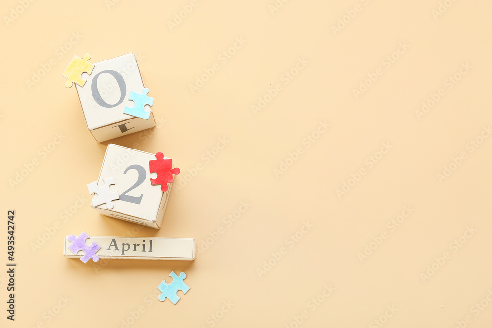Cube calendar with date of World Autism Awareness Day and puzzle pieces