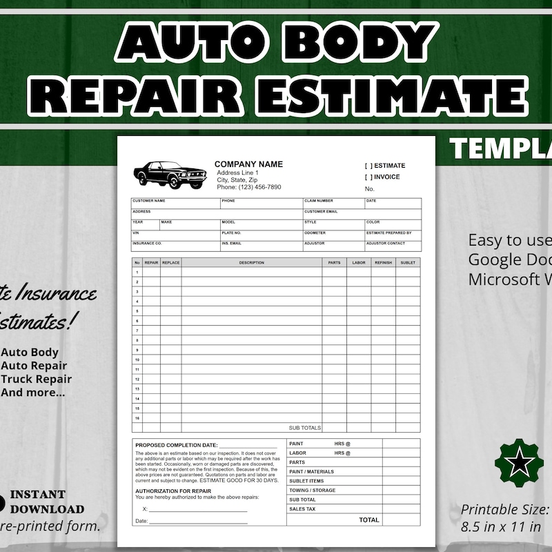 Editable Auto Body Repair Estimate Template WORD Google Docs