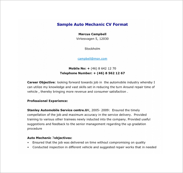 13 Auto Mechanic Resume Sample ZM Sample Resumes