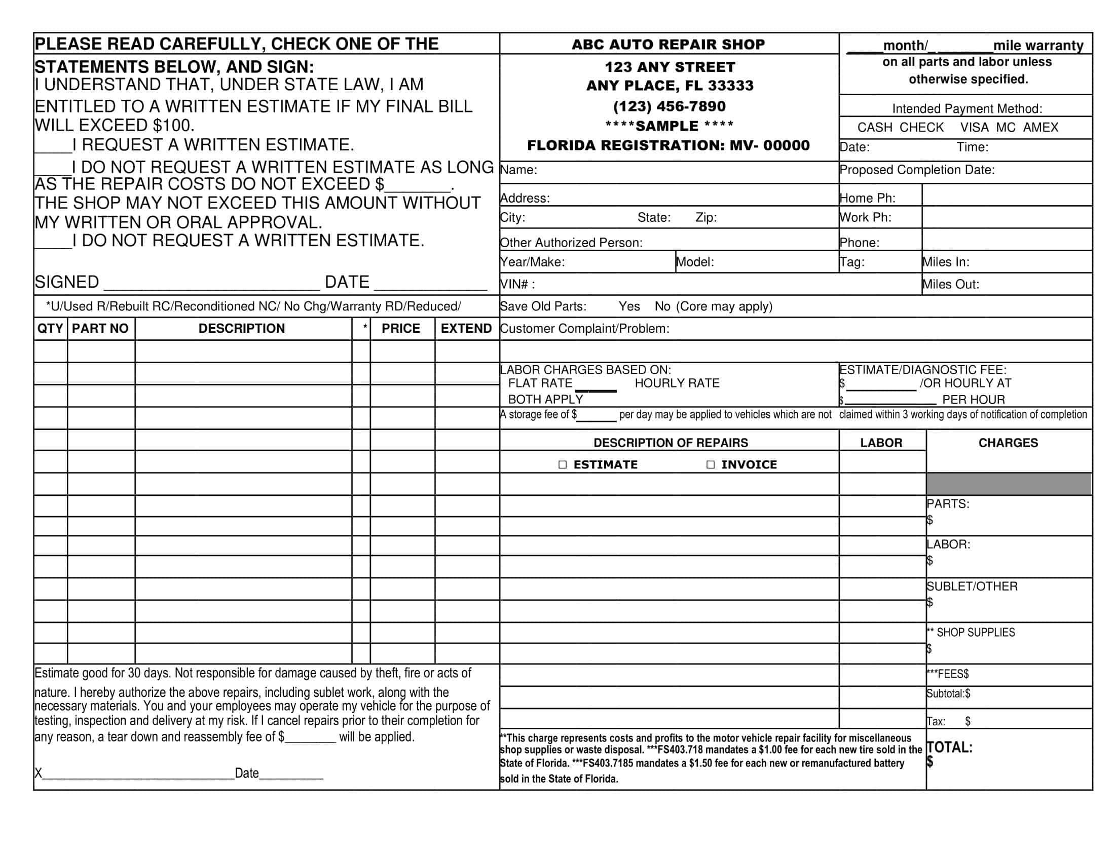 Downloadable Free Printable Auto Repair Invoice Template