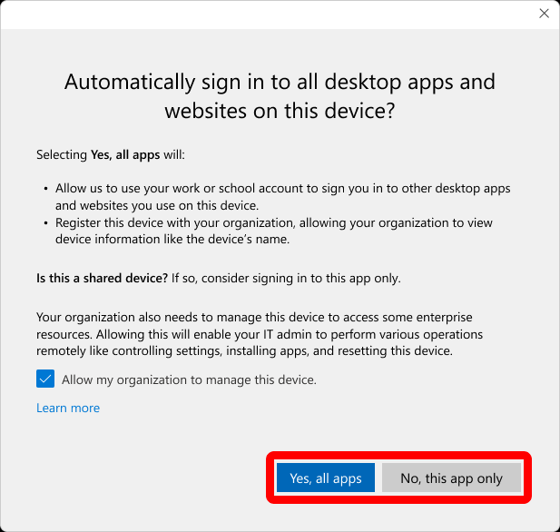 Does checking the Allow my organization to manage this device checkbox