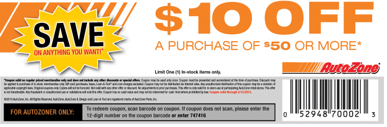 $10 off $50 at AutoZone Printable coupons Coupons Free coupons by mail