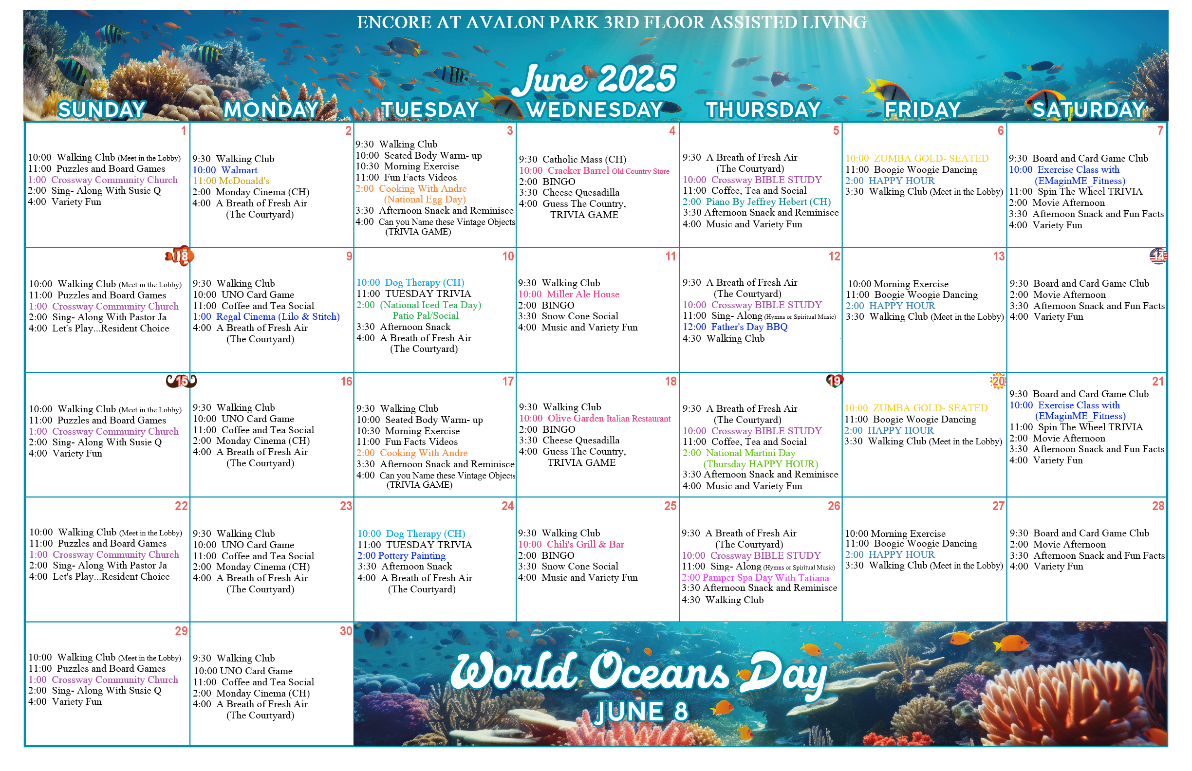 June 2025 calendar of activities for Encore at Avalon Park s 3rd Floor