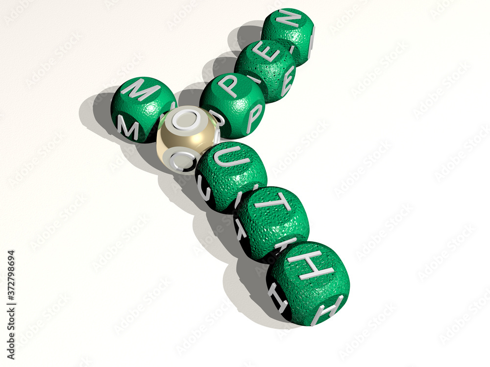OPEN MOUTH crossword of curved text made of individual letters 3D