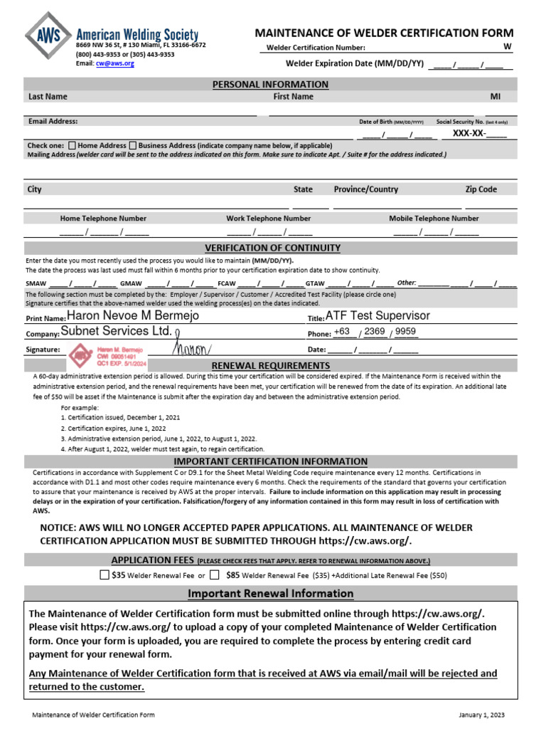 Subnet Maintenanceof Welder Certification Form (01 2023) PDF