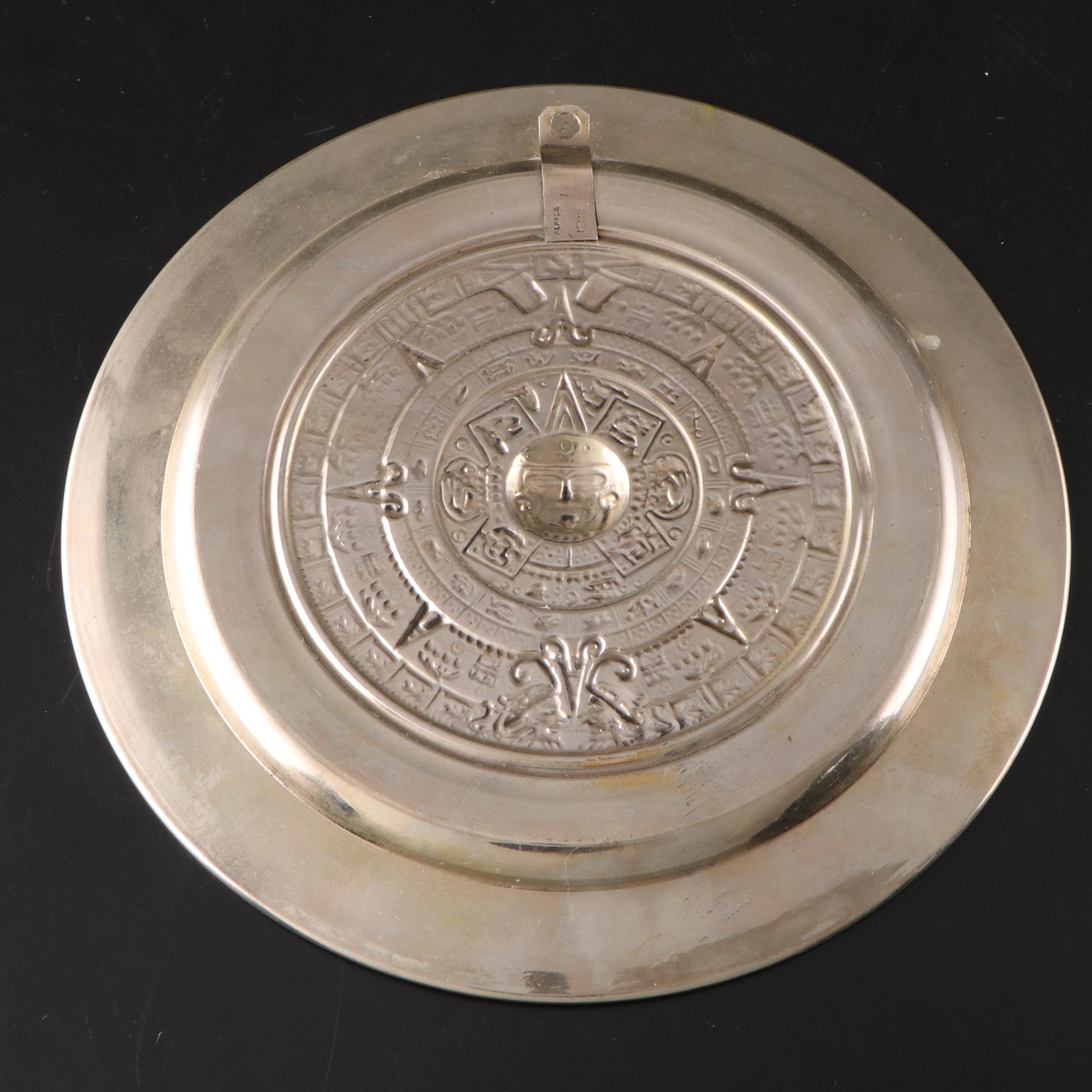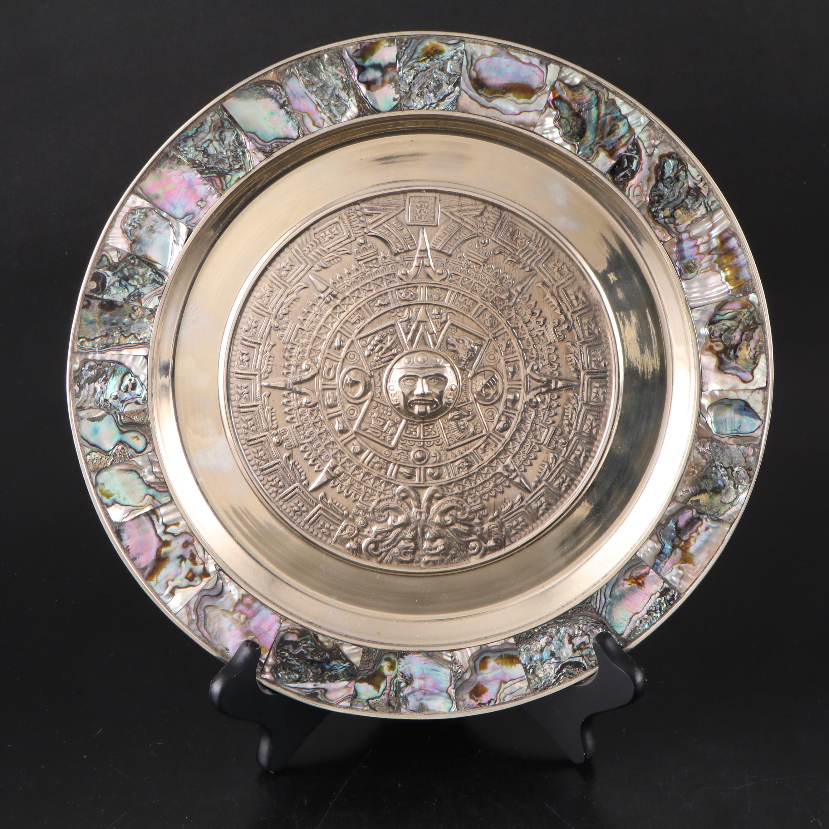 Mexican Abalone Rimmed Alpaca Silver Wall Plates of Embossed Aztec