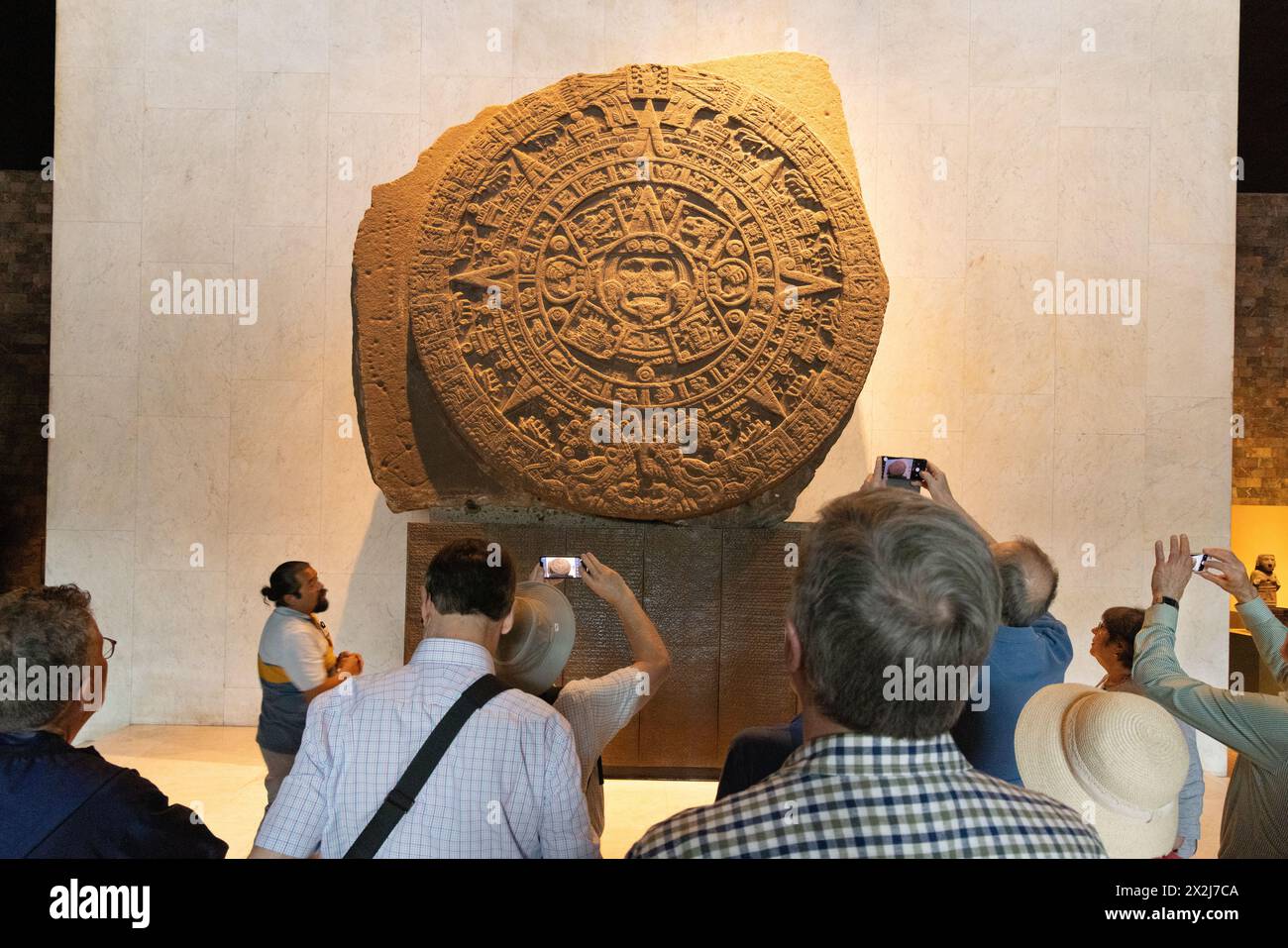Tourists looking at the Aztec Sun Stone or Aztec Calendar early 1500s
