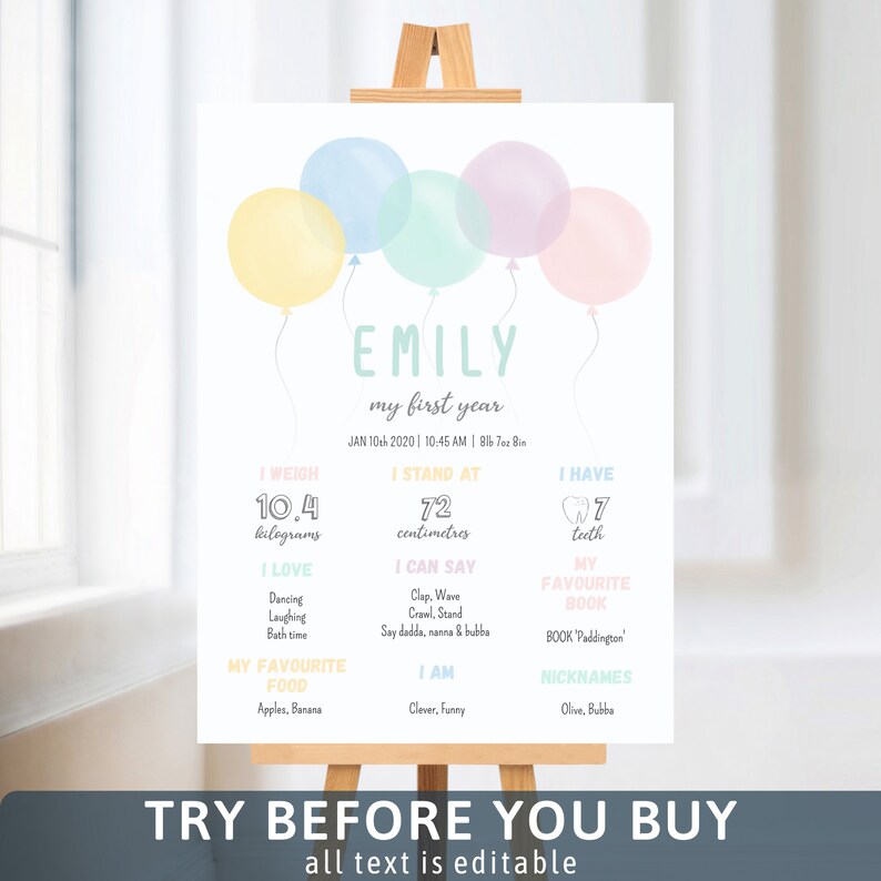 Pastel Balloons Baby Girl 1st Birthday Milestone Board First Etsy