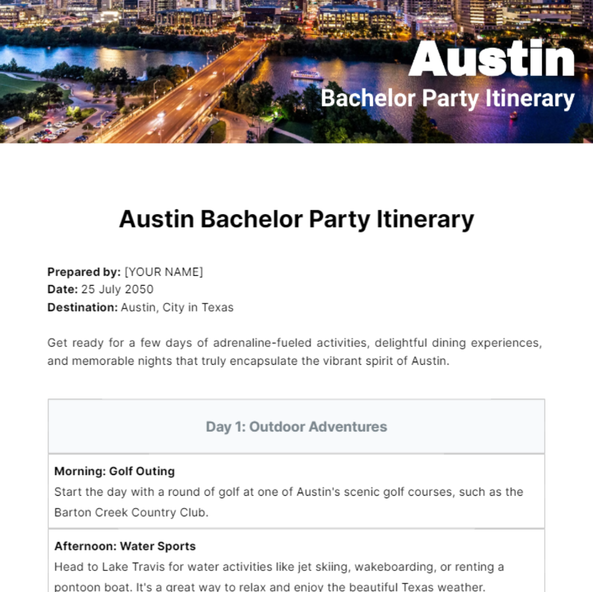 Free Austin Bachelor Party Itinerary Template to Edit Online