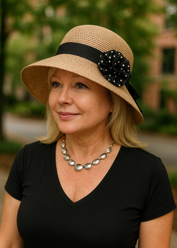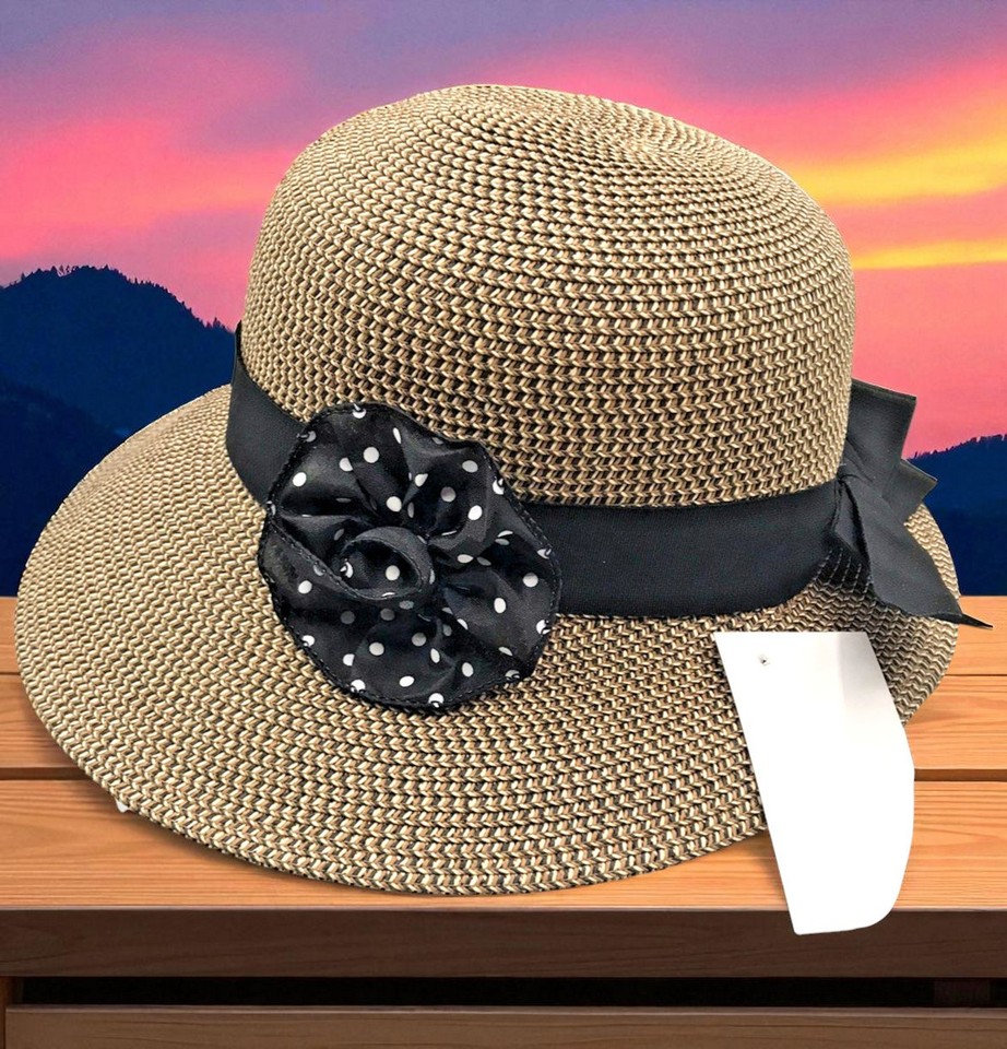 Sun Hat Short Back Bonnet Style w/Polka Dot Rose Bow in Back Black Band