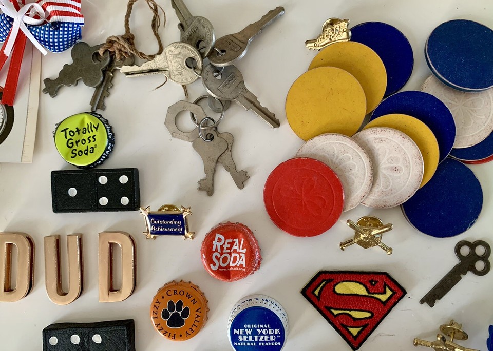 Junk Lot Casino Cards Chips Bottle Caps Pin backs Keys Timer Crossword