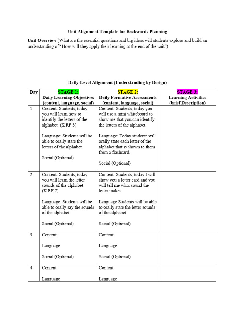 Backwards Planning Template For Unit 5 PDF