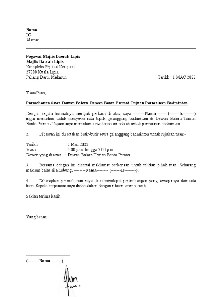 Request to Rent a Badminton Court at Dewan Balora Taman Benta Permai PDF