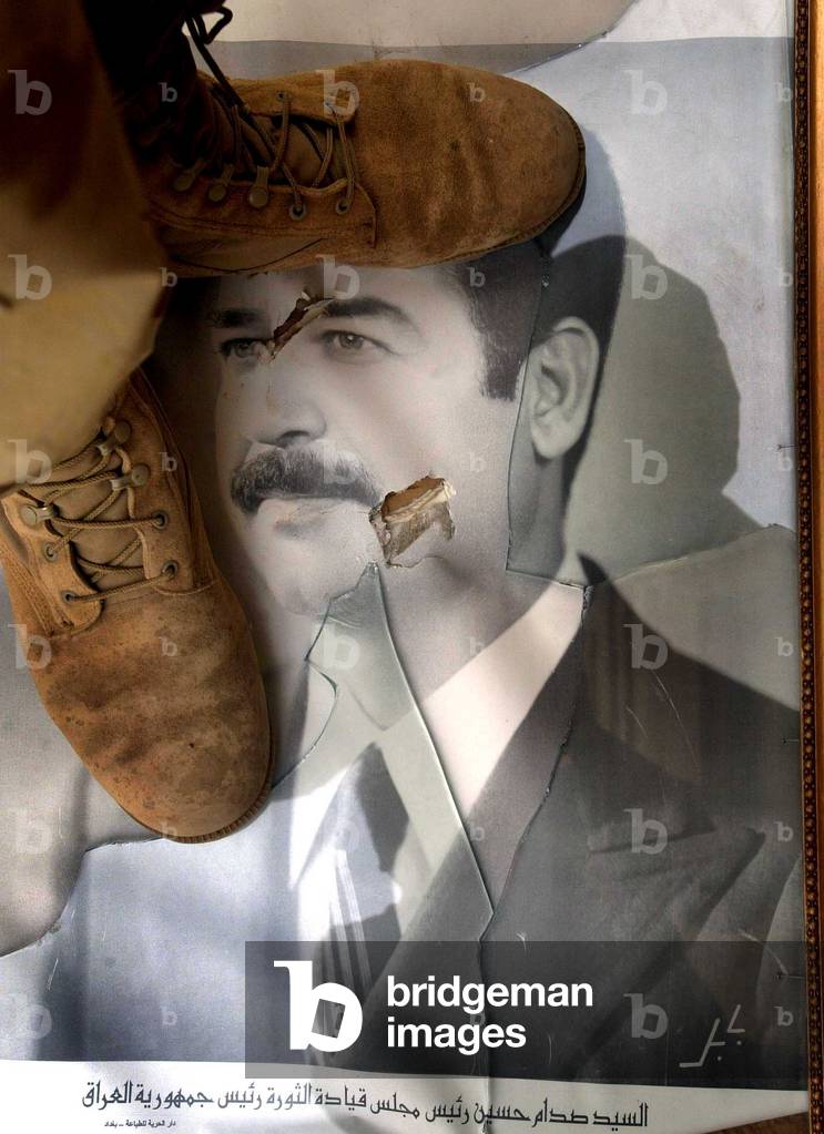 Image of US COMBAT ENGINEER STANDS ON A PORTRAIT OF SADDAM HUSSEIN